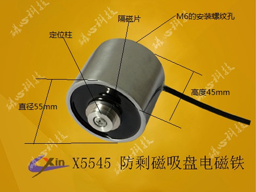 X5545防剩磁吸盤電磁鐵屬于微型直流吸盤式電磁鐵,電磁鐵廠家研發(fā)、生產(chǎn)的防剩磁吸盤電磁鐵X5545具有大吸力的同時可以有效的把剩磁降低至5克之內(nèi),產(chǎn)品的直徑為55mm,高