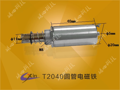 T2040圓管電磁鐵直徑20mm,高度40mm,采用圓管式結(jié)構(gòu),產(chǎn)品可以在節(jié)省空間的情況下產(chǎn)生較大的推拉力,磁心科技批量生產(chǎn)圓管式電磁鐵T2040,具體介紹如下: