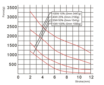 圖解:1,上圖描述電磁鐵的行程和力量曲線(xiàn)圖,橫向代表行程(mm),縱向代表力量(g)。